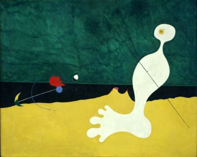 The subject of the painting was described by the artist as “a monstrous solitary figure, enormous feet, sitting on a green plain, the hand supporting the featherweight minuscule head. In front of a cactus exploding in an absurd flower.”