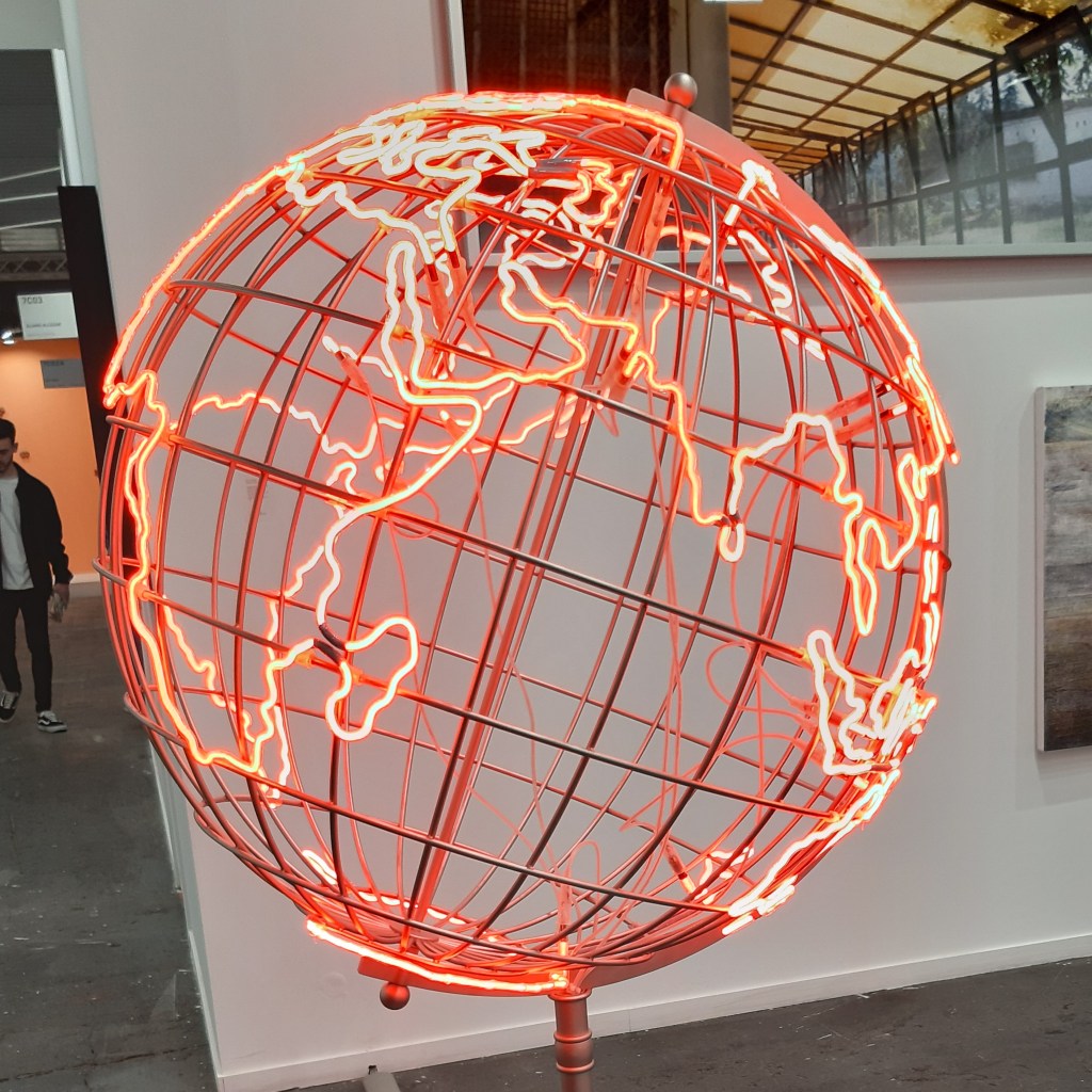 Hot spot is a cage-like globe tilted at the same angle as the earth which uses a delicate neon to outline the contours of the continents enlightening its surrounds with a red glow. This work has been interpreted as description of a world in a continuous conflict and unrest as well as some art critics see in it a questioning of the notions of boundaries. And maybe for its red glow I couldn’t help to remember all the fire that have devastating our planet in the last months.