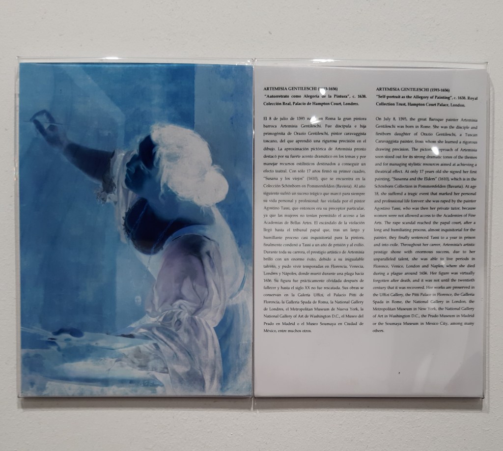 “De entre las muertas” by Diana Larrea. This work is a tribute to the Female Master of Art History; it consists in present or introduce to the viewer some of the great female painters of history, exposing their biographies accompanied by their self-portraits. These self-portraits have been digitally modified by Larrea, to make them look ghostly, by simulating false cyanotypes. The work is a mix of historical research and feminist activism.