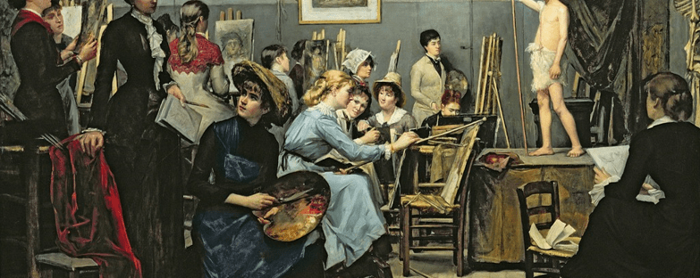 Self-affirmation is common theme among several women artists, most of them have chosen to claim their status by a self-portrait with the tools of the craft; some have preferred to paint a kind of vicarious self-portrait. This painting by Marie Bashkirtseff presents both.
