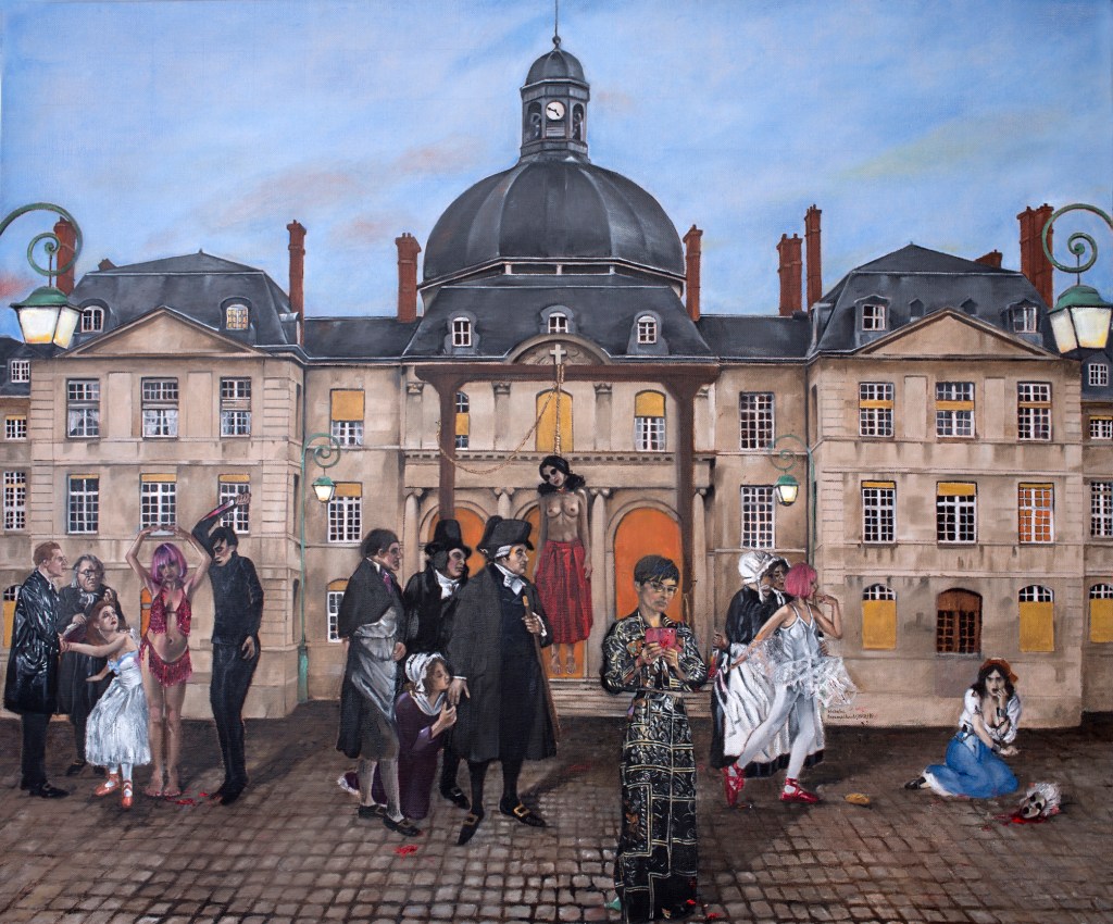 The painting “Massacre of the Madwomen” (2)is based on a black and white print of the event titled ‘Massacre at la Salpêtrière, 3 September 1792. La Salpêtrière, a famous asylum in Paris, during this period operated more like a prison, housing women who were prostitutes, the poor, the mentally ill and the disabled. The Massacre was part of the bloody September massacres in Paris during the French Revolution. On the nights of 3rd and 4th September 1792, La Salpêtrière was stormed with the intention of releasing the detained women. However, out of fear that the inmates would join the foreign and royalist armies, 35 of the women were dragged into the streets and murdered. The painting is a re-imagaing of the Massacre using my performance still images as well as characters from other sources, such as the film, ‘The Red Shoes’ and ‘Das Cabinet des Dr Caligari.’