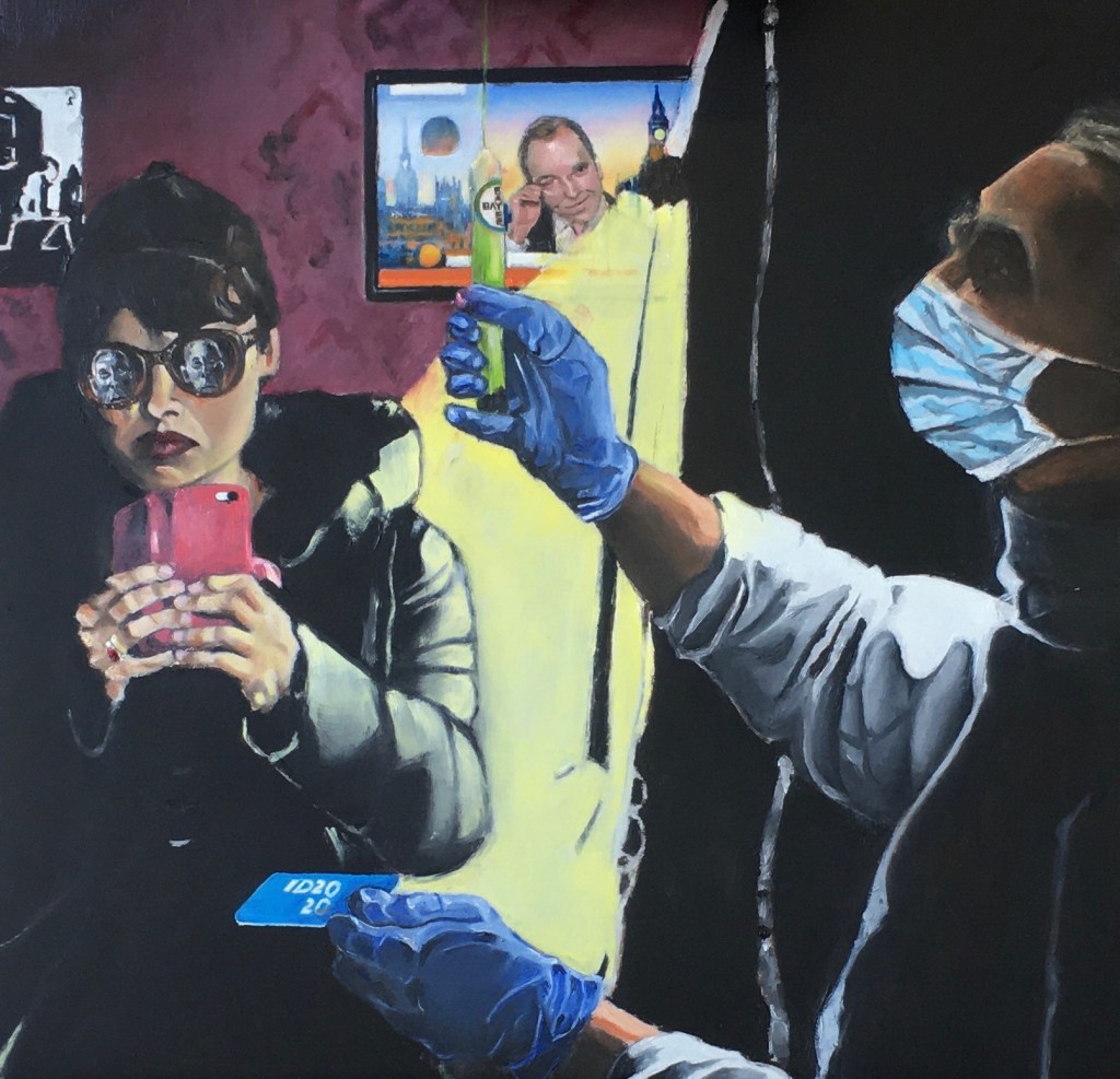The importance of self-portraiture relates back to my interest in Performance and a search for my own voice. In one of my more recent paintings, ‘ID2020’ (4), I have Matt Hancock on a tele screen behind a self-portrait of myself in sunglasses. Reflected in the sunglasses is the image of John D. Rockefeller and I am about to be injected with a syringe labelled ‘Bayer Bayer.‘ The doctor and the position are taken from the 1960s sci-fi film ‘La Jetée’ by Chris Marker. It is an imaginary depiction of World War 3. It brings the past, present, personal and political together into one image.