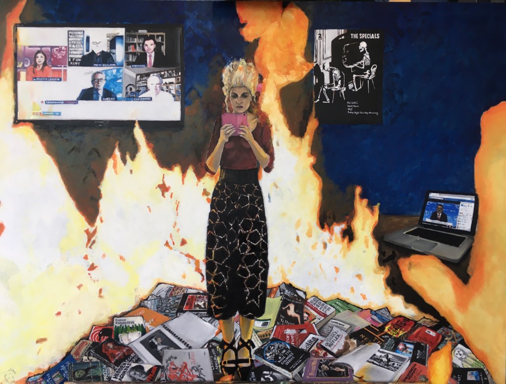 I don’t have a favourite but I feel ‘Herstory Rhymes’ (5) is an importance piece amongst my works as I feel this encapsulates everything that is relevant to my practice and shows the most development from my early stages. There is reference to the film ‘Fahrenheit 451’ as the setting. I have changed the book titles so that each book is important in terms of censorship as well as my personal story. The poster which is about to burn in the background is ‘Ghost Town’ by the Specials. This references the deep recession of the 1980s and suggests the notion that ‘history doesn’t repeat, but it rhymes.’ My self-portrait is again a reflection of the apathy of people ignoring what is happening around them whilst looking at their mobile phones.