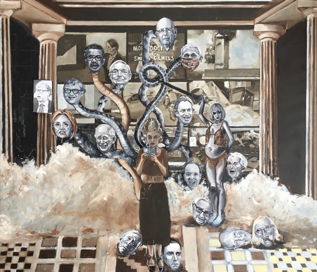 In my painting I have replaced the heads with politicians and people accused of orchestrating the constraints emerging on civil rights around the world. I am in the forefront of the painting looking at mobile phone – in my Marie-Antoinette wig – ignorant of what is happening around me. I have used one of my performance stills, as Salome, and am about to strike one of the serpent heads. In the background there are screens depicting the widespread propaganda prevalent in the major media outlets around the world.
